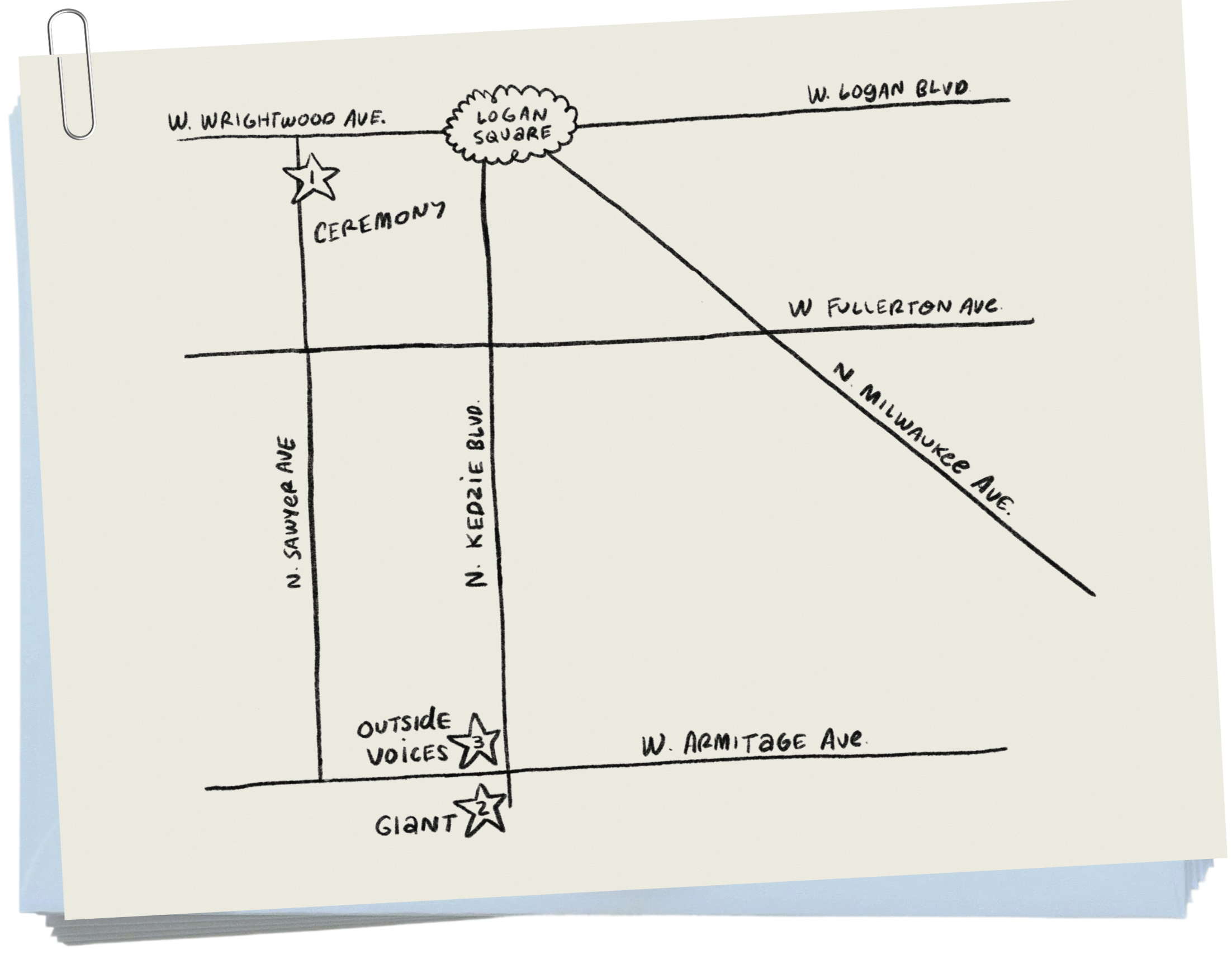 By train, we’re steps from the Logan Square Blue Line stop. Exit toward Kedzie.